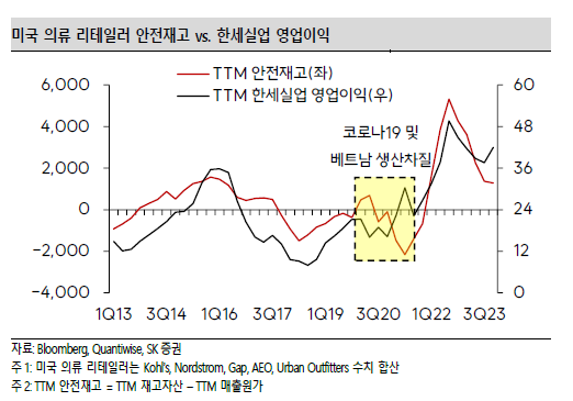 동사의 과거 실적은 미국 의류 리테일러들의 안전재고(재고자산 – 매출원가)에 연동 되어왔다. 올해는 고객사의 Destocking이 전반적으로 마무리되고, 오더가 정상화되는 사이클에 진입할 것으로 전망됨에 따라 동사의 실적은 연중 내내 안정적인 성장 흐름을 보일 것으로 전망한다.