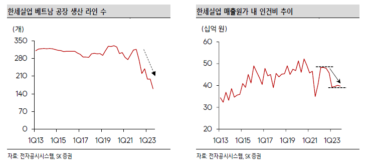 으나, 코로나19 기간 공장 셧다운과 ‘22년 오더 축소에 따른 인력 감축으로 최근 베트남 생산 비중이 크게 낮아진 상황이다. 올해 오더 회복 사이클에서 베트남 생산 비중은 점차 회복될 것으로 전망한다.