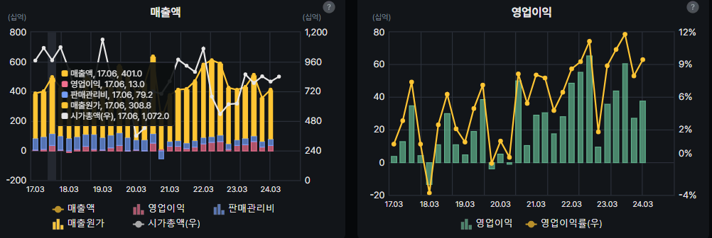 1Q24 매출액 4,118억원 (Flat), 영업이익 381억원 (+6%, OPM 9%)