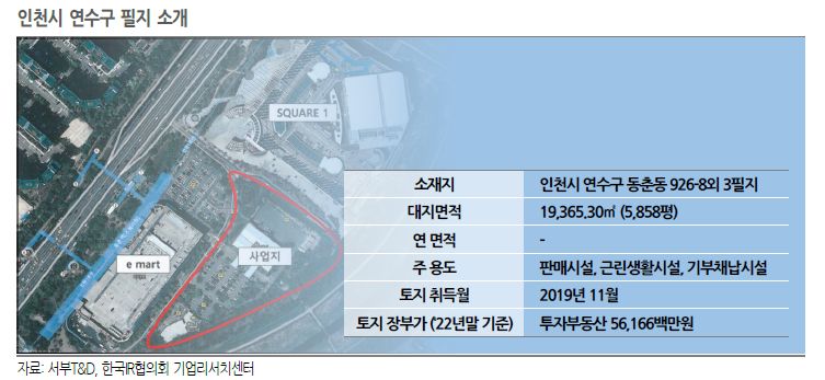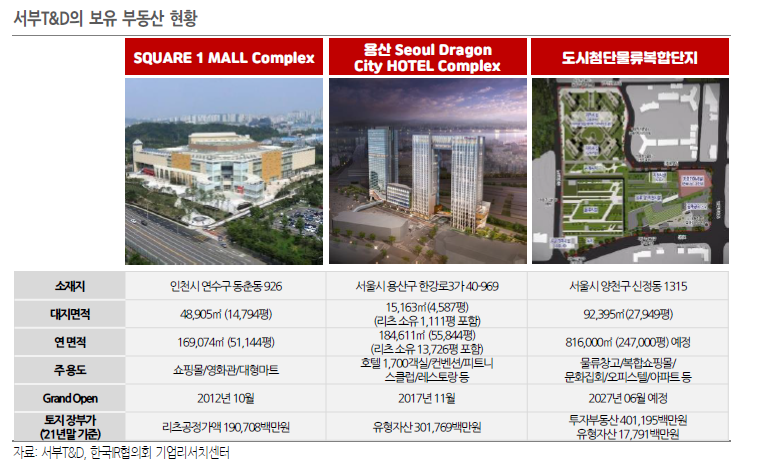 - 서부T&D의 주요 사업부 및 보유 부동산은 1) 스퀘어원 복합쇼핑몰 사업(인천시 연수구), 2) 서울드래곤시티 호텔 플렉스 사업(서울시 용산구), 3) 도시첨단물류사업(서울시 양천구)