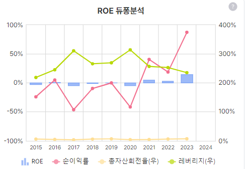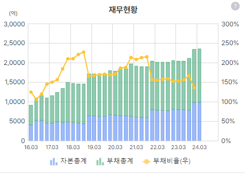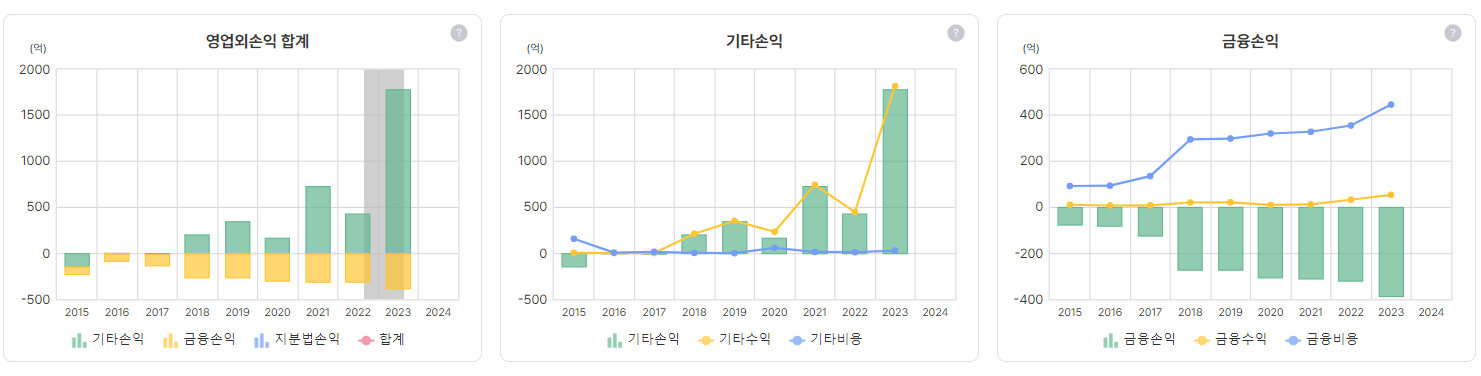 23년 4분기는 부동산 재평가로 순이익이 튀었고, 23년 영업이익이 400억인데 금융손익(이자비용)이 거의 400억 만큼 나왔다. 부채비율이 140%정도 되는 건 아쉬운점. 거기에 새로운 부동산 개발하면 이자비용 등 많이 들어갈 것 같은데.