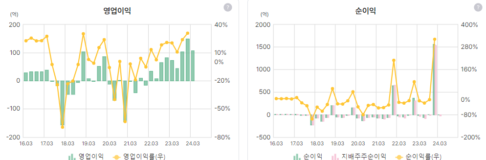 이익률도 역시 상승, 순이익률이 튀는 건 한 번 확인해봐야할듯, 일회성 수익이 있는 듯?