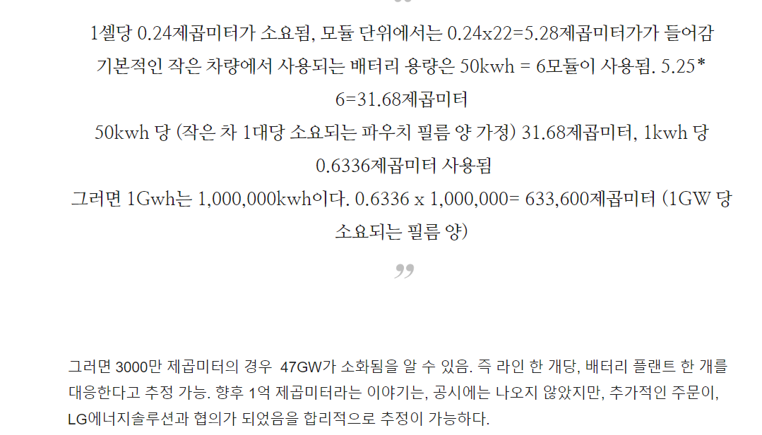 - 보통 셀을 개발할 때 소재들이 정해지면 어지간해서는 변경하지 않는다. 또한 기존 파우치 필름을 독점하고 있던 dnp와의 협상에서 lges가 우위를 차지하기 위해서는 새로운 벤더를 키워주는 것이 당연한 이치. 따라서 183um 두께에서는 율촌화학이 독점적 지위를 상당 기간 유지할 것으로 생각