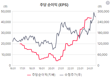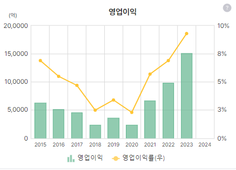 바텀업 방식에서 자동차 부품주가 필터에 걸려 가볍게 살펴봤다. 서연이화의 경우 우선 현기차에 87%(23년 기준)의 매출이 발생한다. 현기차의 실적에 좌지우지 된다는 의미이다. 최근 현대차의 재무지표를 보면 우상향 중인 것을 알 수 있으나, 뭔가 확실한 한 방이 없는 느낌이다. 현기차가 현재 전기차 시장에서 확실한 주도권을 쥐고 있는 것도 아닌 것이 크다. 또한 서연이화가 현기차의 협력사로 위치해 있는 것이지 서연이화가 독립적으로 해자를 가질 만한 제품이 있는 상황도 아니다. 현기차와 서연이화는 인도지역에도 많은 투자를 하고 있는데 이는 C(cost)가 줄어듦을 의미한다. 주가의 폭발적 성장은 P(price)의 증가, Q(quantity)의 증가, C(cost)의 감소로 인한 이익의 증가로 발생하는데 C의 감소는 어느정도 보이나, P의 증가는 물음표가 붙고, Q의 증가 역시 현대차만의 해자가 없으므로 뭔가 좀 아쉽다.