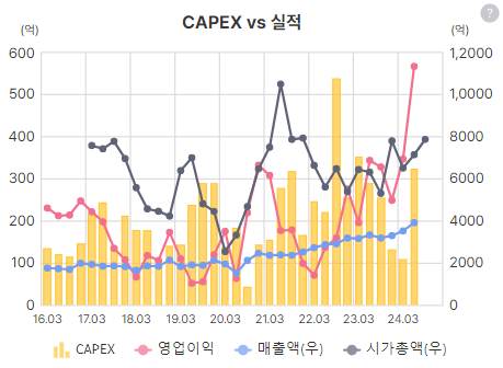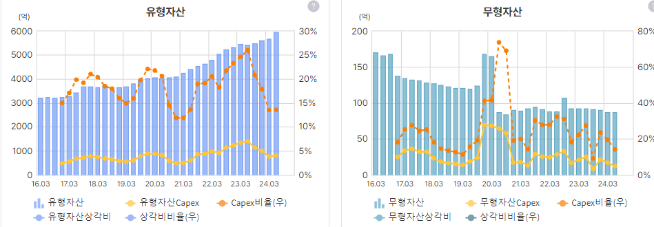 우형자산 계속 증가중, 22년 23년에 투자가 많았고 최근은 좀 줄어있음, 추세를 보면 최근은 CAPEX를 늘린다기보다 현상유지 및 매출증가에따른 대응으로 봐야할듯