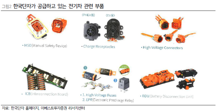 cf. 국내 공급시 한국단자는 2차벤더. 경신(비상장)과 유라코퍼레이션(비상장)을 통해 현대 기아차 등의 완성차 maker에게 차량용 커넥터를 공급. 이 과정에서 국내 완성차 업체들의 수출 물량은 한국단자의 내수 매출로 인식되는 경우가 많음. 따라서 해외 매출액은 글로벌 자동차 maker에게 커넥터를 직납하는 경우가 대부분이라고 추정할 수 있음. 그리고 이 물량은 기존 내연기관 차량이 아니라 전기차용 부품일 것으로 생각됨.