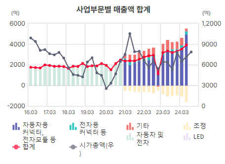 매출의 대부분은 커넥터이고 이중 자동차용 커넥터가 대부분을 차지하며 증가중임을 알 수 있음