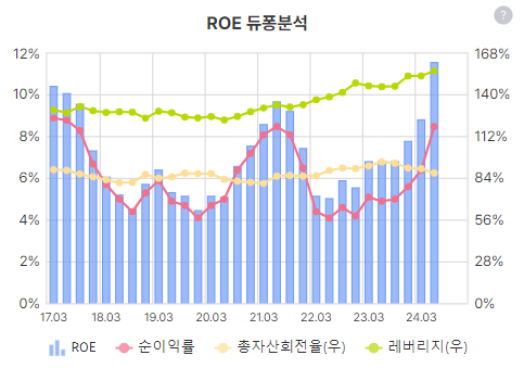ROE가 늘고있으나 부채비율과 함께 증가중으로 조금 아쉬운 부분