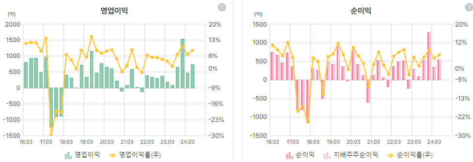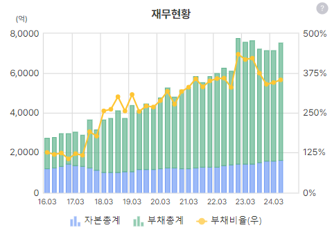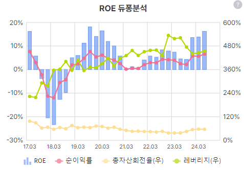 ROE 15%가 넘지만 부채비율이 높은 상황에서의 수치이니 크게 의미는 없는 듯 하다