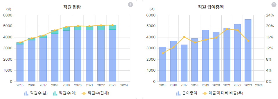 직원수는 소폭 상승 중, 급여총액은 꾸준히 늘고있다