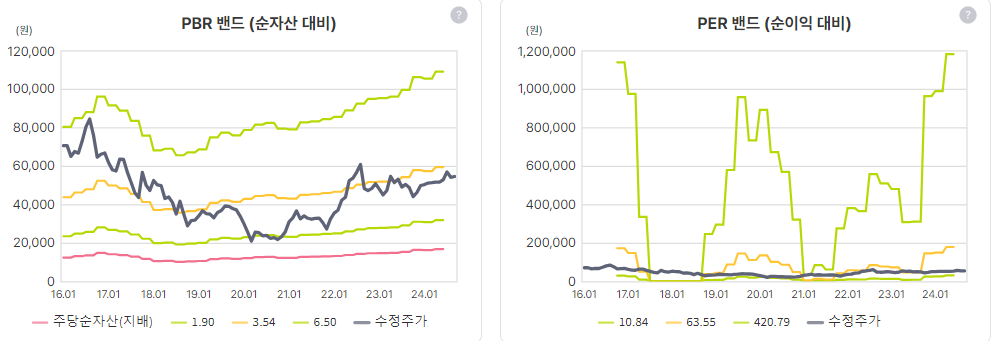 이익이 들쭐날쭉해서 PER밴드는 참고가 안될 듯 하고 PBR기준으로는 주가가 그리 높은 상태는 아니다(전의 주가와 상대비교 했을 때)