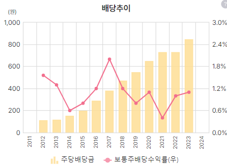 배당율은 비슷하게 유지 하지만 배당금은 꾸준히 늘고 있음