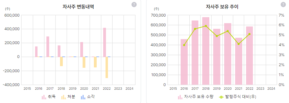 자사주는 매수도 하고 매도도 하는 데 전체적 보유량은 약간 우하향 하는 느낌