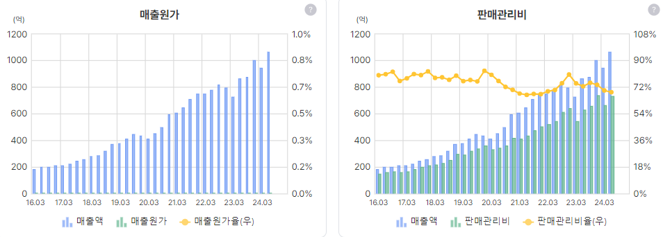 매출원가는 잡히지 않고 판관비로만 비용이 깎이는 듯, 판관비율 플랫함