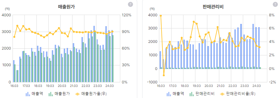 매출원가는 90%로 높고 판관비율은3%대로 낮음 좀 특이