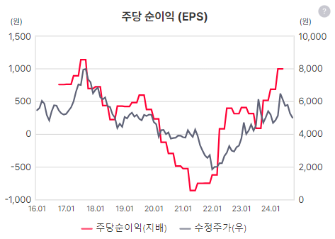 EPS상승세가 보임, 이것이 지속되면 주가가 반응하지 않을까? 모니터링 한다면 앞으로의 실적 추적이 중요해보임