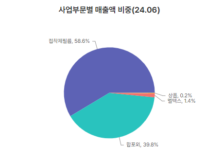 동사의 주력 제품인 Hot melt 접착 필름은 피착제 사이에 액상이 아닌 필름을 사용하여열과 압력을 가하는 방식으로 사용되며, 주로 신발 인솔 등의 접착에 쓰임 적용 분야 또한 신발, 자동차, 건축 등으로 확대되고 있음