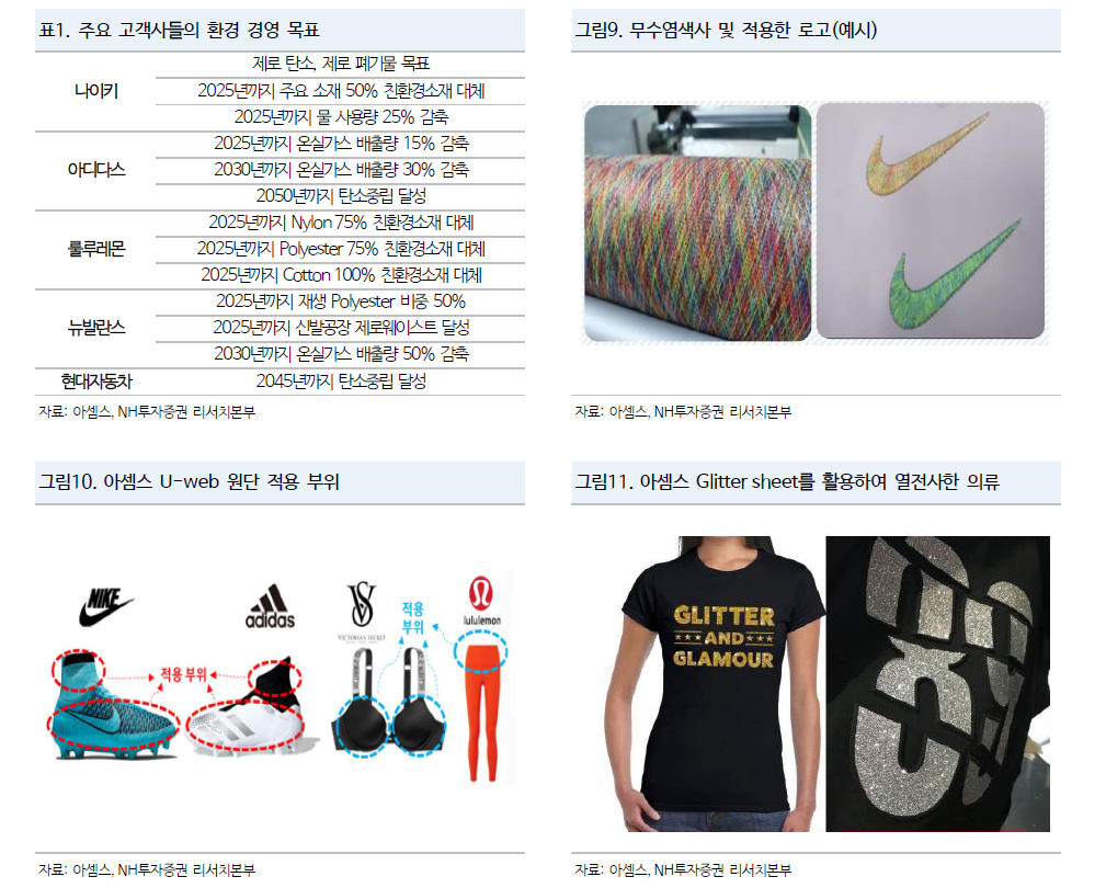 주력 제품인 친환경 접착 필름은 나이키, 아이다스 등 글로벌 메이저 풋웨어에 적용되고 있으며, 글로벌 고객사들의 친환경 경영 가속화에 따른 적용 확대 추세. 또한 자체 연구개발을 지속하며 무수염색사, U-web, Glitter Sheet 및 다양한 친환경 접착제 등 풋웨어, 의류 관련 소재로 신규 제품 포트폴리오 확대 중