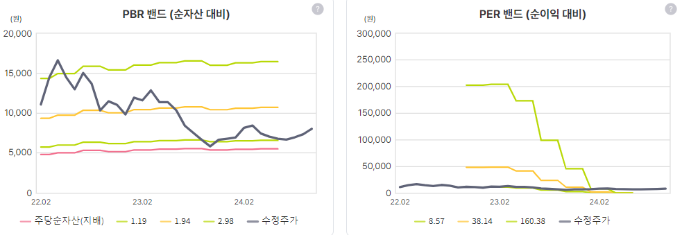 순이익 하락으로 PER밴드는 그닥 의미가 없는 듯 하고 PBR밴드는 하단 위치