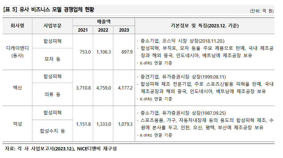 동사는 합성피혁 외에도 부직포, 모자, 폴리우레탄 레진 등의 원부자재 생산과 판매를 통해 매출을 시현하고 있으며, 베트남과 중국, 방글라데시에 계열회사를 두고 이를 활용하여 해외 각지에 제품을 유통하고 있다. 특히 자회사 ㈜다다씨앤씨를 통한 모자 매출이 순항하고 있는 가운데, 합성피혁을 스포츠 악세사리 용품 등에 접목 하고, 모자 사업과도 연계하여 유기적인 협업구조를 통한 사업 규모 확장을 목표로 하고 있다.