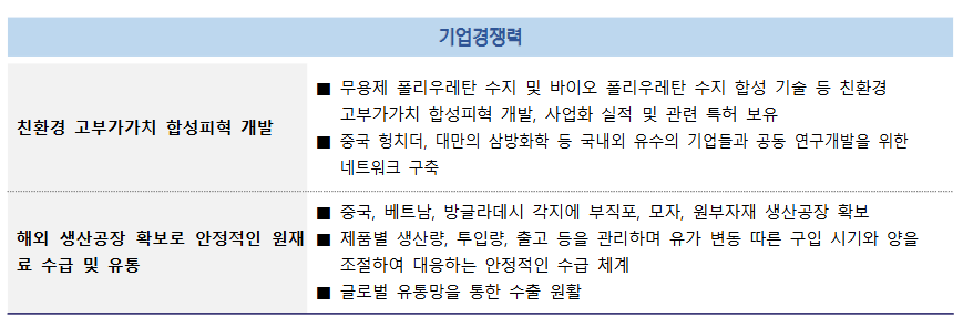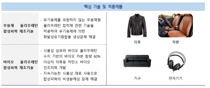 또한, 동사의 합성피혁 소재는 부직포 원단에 폴리우레탄 수지를 코팅한 제품이나, 제조공정의 개선을 통해 폴리우레탄으로 인한 환경오염을 예방하고 있다. 동사 핵심제품에 적용된 친환경 합성피혁 제조기술로는 크게 무용제형 폴리우레탄 수지 합성 기술과 바이오 폴리우레탄 수지 합성 기술로 나눌 수 있다.
