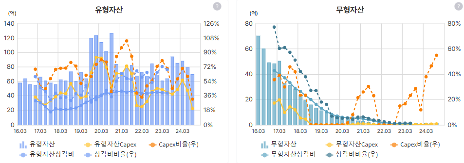 생산설비가 필요치 않은건지 유형자산은 오히려 줄고있는 모습, 무형자산은 거의 없음