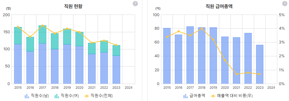 매출은 느는데 임직원은 줄고있음. 아웃소싱을 한건지 확인할 필요가 있을듯. 아무래도 의류분야는 인건비가 중요한 것 같은데 매출은 느는데 비용은 줄다니 뭔가 이상