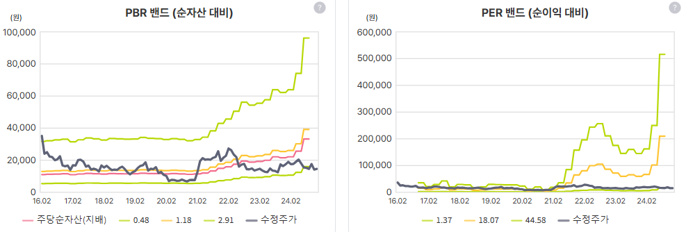 밴드상 하단에 PBR 0.43, PER 1.2로 매우매우 낮음. 이렇게 낮으면 사실 문제있는 기업인 경우가 많은데 살펴볼 필요 있음