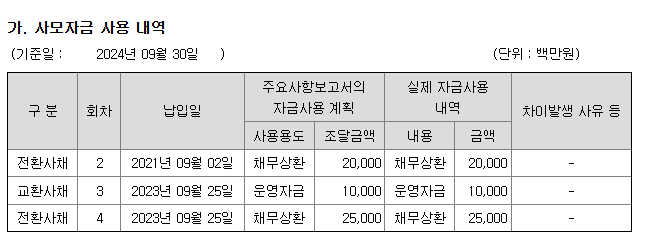 사모자금을 꾸준히 사용하는데 사용 이유가 채무상환 및 운영자금 때문. 이유가 좋지 않음