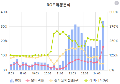 최근 ROE가 급격히 늘어났으나 부채가 증가했으므로 좀 더 살펴볼 필요가 있음