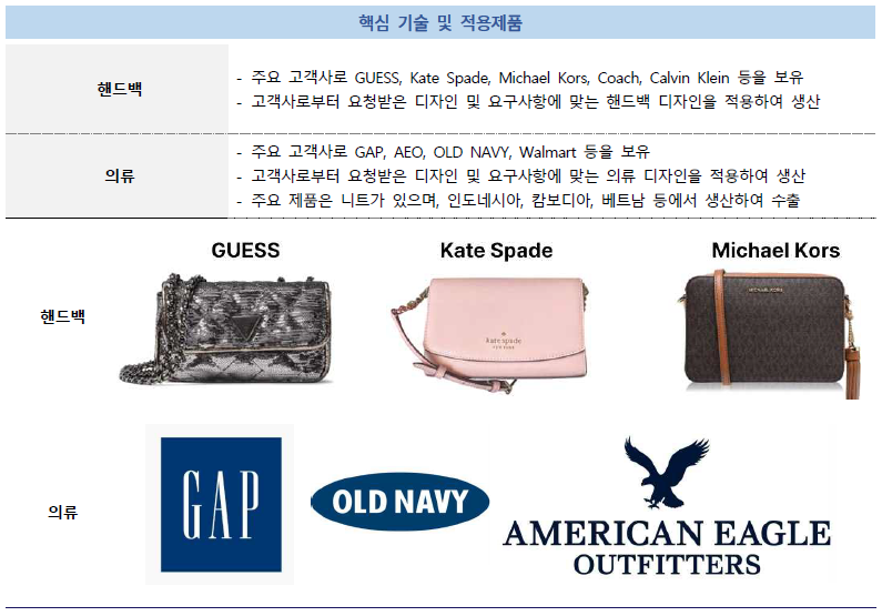 크 등을 바탕으로 핸드백/의류 OEM/ODM 시장을 선도하고 있다.
