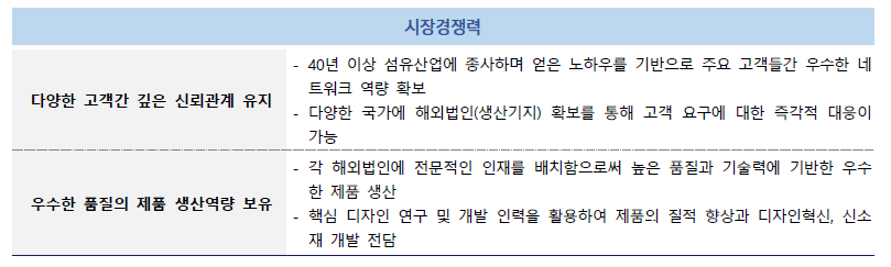 의류를 제조하여 공급함으로써 안정적으로 매출을 시현하고 있으며, 우수