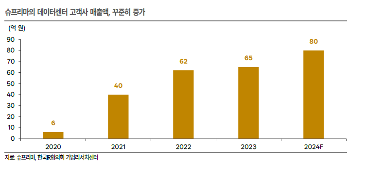 주목할 만한 점은 슈프리마의 데이터센터 고객사 매출이 꾸준히 성장하고 있다는 점. 2020년 6억 원 수준에 불과하던 매출이 2021년 40억 원으로 성장한 이후, 2022년 62억 원, 2023년 65억 원으로 지속적인 증가 추세를 나타내고 있음. 더욱이 2024년에는 80억 원 수준까지 도달할 것으로 전망. 이러한 성장세는 AI 애플리케이션 증가에 따른 데이터센터 증설 수요와 맞물려 슈프리마의 제품 경쟁력이 시장에서 인정받고 있음을 방증