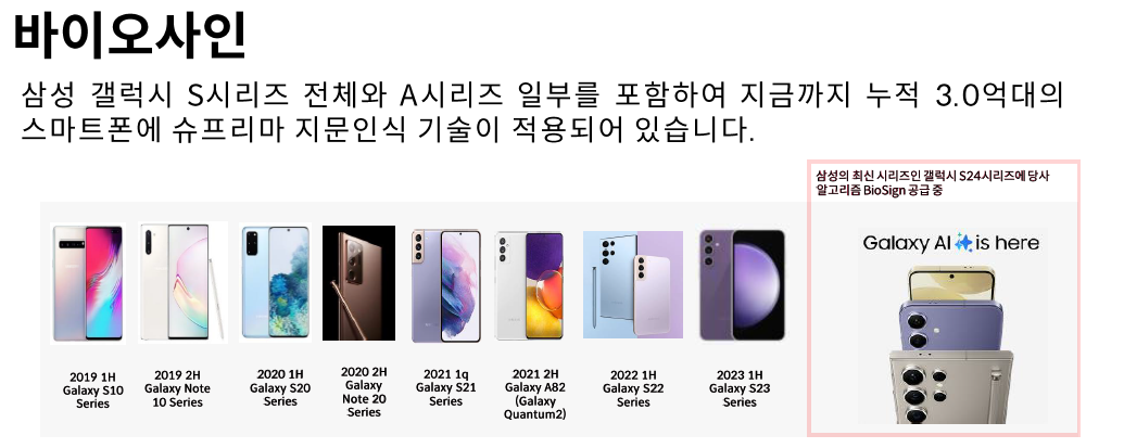매출 중 일부(50억 가량)는 스마트폰용 지문 인식 알고리즘인 BioSign을 판매. BioSign은 특히 초음파 방식의 센서와 높은 호환성을 보여 삼성전자의 갤럭시 S 시리즈를 비롯한 프리미엄 스마트폰에 널리 채택되고 있음. 이 알고리즘은 최신 딥러닝 기술을 활용하여 지문의 미세한 특징을 추출하고, 패턴 매칭 속도를 최적화하여 빠르고 정확한 인증을 제공