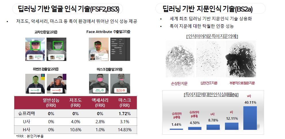 - 바이오 인식 솔루션(Biometric Solution) 부문. 바이오 인식솔루션 사업은 매출 비중으로는 상대적으로 제한적이지만, 슈프리마의 정체성과 기술력을 상징하는 중요한 의미를 지님. 슈프리마는 창업 초기에 지문인식 알고리즘 경연대회 FVC(Fingerprint Verification Competition)에서 1위를 차지하며 기술 기업으로서의 입지를 다졌음. 슈프리마는 지속적인 연구개발을 통해 BioSign, SFM 시리즈, Q-Face 등 첨단 바이오 인식 솔루션을 개발하고 있으며, 이들 제품은 글로벌 시장에서 높은 평가를 받고 있음. 스마트폰용 지문인식 알고리즘과 AI 기반 얼굴인식 기술 등은 슈프리마의 성장 동력으로서 역할을 할 것으로 기대됨