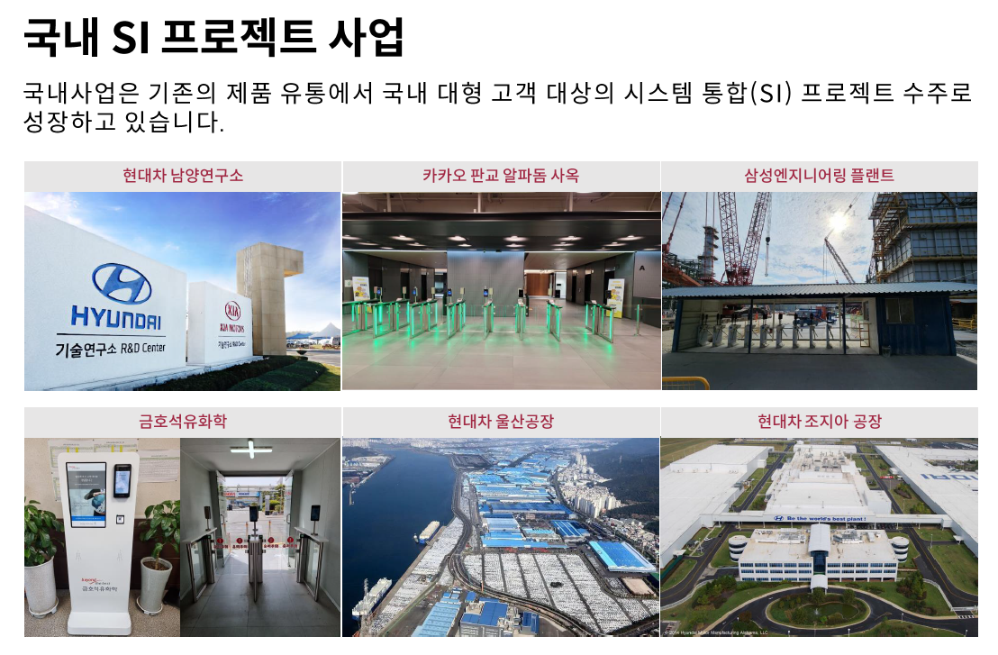 - 통합 보안 시스템(Integrated security system) 사업 부문. 얼굴인식, 지문 인식 등의 바이오 인식 기술과 모바일, RF 등 비접촉 기술을 활용한 출입 보안 및 근태 관리 시스템을 제공. 대표적인 제품으로는 BioEntry, BioLite, BioStation, FaceStation 등