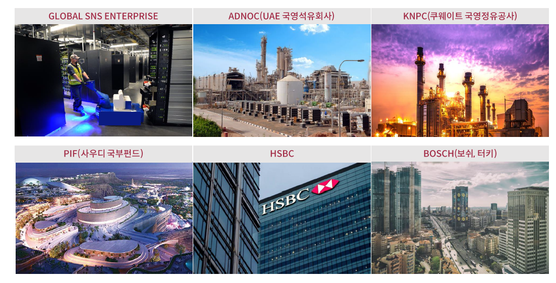 주요 고객사로는 삼성전자, 보쉬 등을 포함한 글로벌 기업은 물론, 국내 공공기관에는 한국전력공사, 서울 교통공사, 인천국제공항 등이 있다.