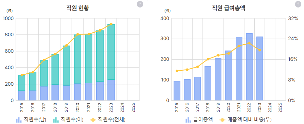임직원 꾸준히 늘어나느 중, 다만 급여총액은 오히려 23년에 줄어듦