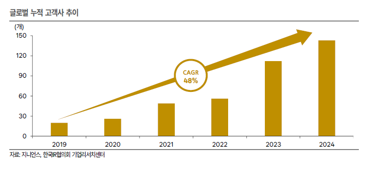 사의 글로벌 누적 고객사 수는 2019년 20개 업체에 불과했으나, 2024년말 약 143군데의 해외 고객사를 확보하며 연